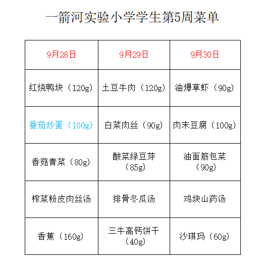 一箭河实验小学2025-2026学年第一学期第5周学生菜单