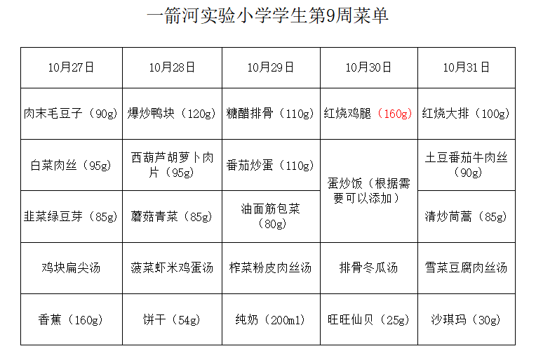 一箭河实验小学2025-2026学年第一学期第9周学生菜单