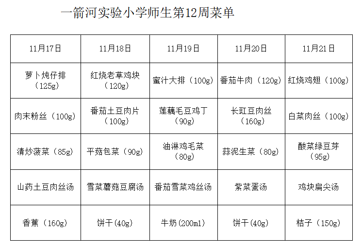 一箭河实验小学2025-2026学年第一学期第12周学生菜单