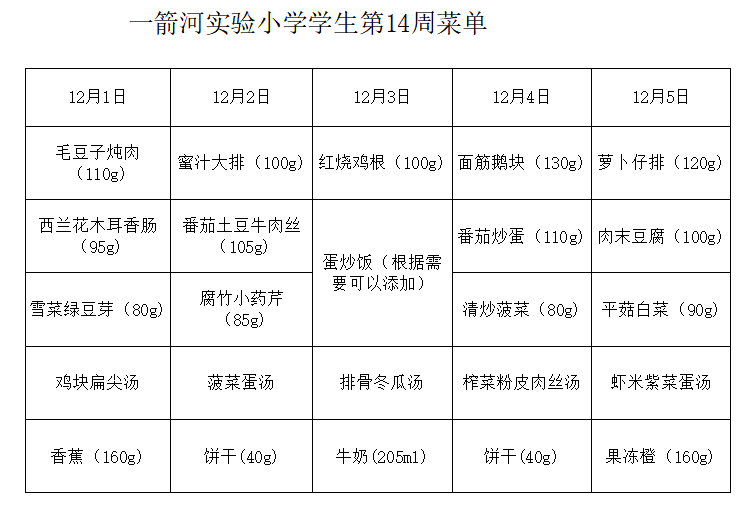 一箭河实验小学2025-2026学年第一学期第14周学生菜单