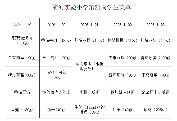 一箭河实验小学2025-2026学年第一学期第21周学生菜单