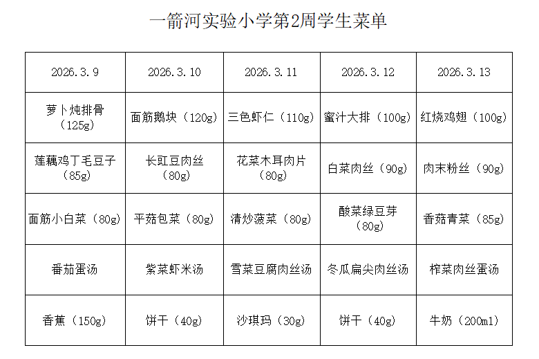 一箭河实验小学2025-2026学年第二学期第2周学生菜单